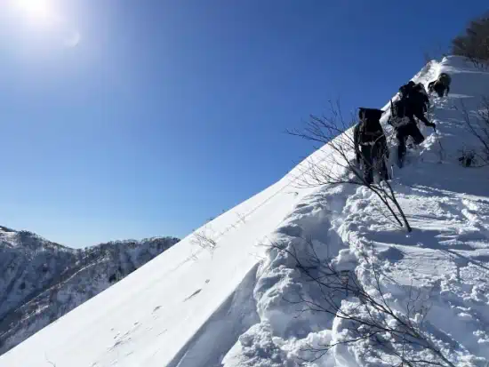 今日は12時までに登れるところまで登って下山の予定だ。11時を過ぎても目標だったラクダのコルはほど遠い。せっかく天気がいいのだから、少しでも上に行きたい。全然進まず、トレース以外の道も少ないので、後半はトレースを多めに使う。ここから見えるピークらしきところまで行くのが、時間的にギリギリだろう。最後のラッセルを誰がするかということになったが、一瞬の沈黙。まだ、体力は残っていたので、せっかくの訓練なのだから、力尽きるまでやろうと思い、ラッセルに立候補。この選択は大正解だった。既にあるトレースを少し左に逸れると生い茂っていた木が少なくなり、視界が開けてきた。今日は天気も快晴で、非常に気持ちがいい。雪庇に気をつけると本で読んだことはあったが、もう少し木のギリギリを歩いた方がいいと教えてもらって初めてこれが雪庇なのかと知る。雪庇を踏み抜くと、昨日、積雪が少なくてできなかった滑落停止訓練ができそうな斜面に見えたが、怖いので、滑落しないように木にぶつかりながら進む。さすがに疲れてきたが、こんなに綺麗なところを自分でトレースをつけながら歩くのはとても楽しく、最高の時間だった。