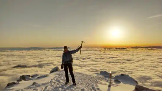 前常念岳までの道は昨日同様にそれなりの急登だが、荷物が軽いのでその分楽に登れた。樹林帯を抜け、周囲が開けてきたところで、正面に現れた満月は、早くから歩き始めたご褒美のようなものだ。森林限界を超えても風はほとんどなく、雲海になっていたので、山頂付近の天気はよさそうで、期待が高まる。6時半頃、前常念岳の手前あたりで日の出を迎える。あたり一面に広がる雲海から顔を出す太陽はとても綺麗だった。