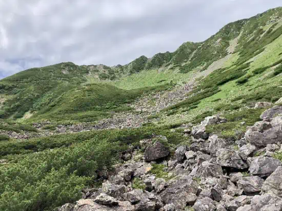 上部のカールはこの時期なので、お花畑が広がっていると期待していたが、鹿による採食被害の影響なのか?思っていたより高山植物の群生はなかった。ただ、チングルマ、イワカガミなどは多く見られ、小仙丈カールから見上げる稜線は非常に綺麗だ。2,700mを過ぎると水が枯れたため、ここで沢装備を解除し、稜線目指して詰め上げる。右手のハイマツが切れたガレを登り詰めると藪漕ぎなしで一般道に出た。
