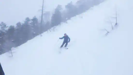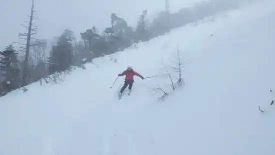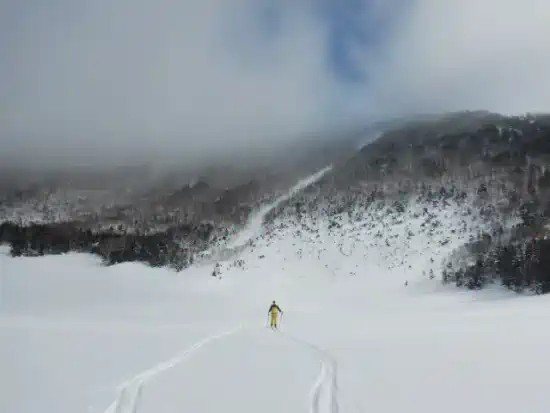 ここからコンパスを合わせて標高差で30mほど藪の中を降りていくと忽然と七ッ池シュートがその姿を現す。傾斜40度ほどと聞いていたが実際は30度程度か?上部はアイスバーンだったが、2-3ターンすると軽い新雪が溜まっており、快適滑降となる。眼下に真白な七ッ池を見下ろしながらの滑降は気分爽快だ!