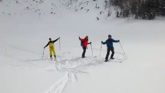 この山行は変更の多い山行だった。まずはリーダーが体調不良による不参加で私に変更、初日の鍋倉山スキーこそ残りの7名で予定通り北面パウダーを楽しんだが、翌日はいろいろあって結局4名となり、当初予定していた黒姫山東尾根は雪不足&新リーダーの私が前から行ってみたかった黒姫山・七ッ池シュートにリーダー権限で強制ルート変更と相成った。