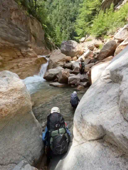 赤沢出合では赤と青の見事なコントラストを見ることができ、そこから10分ほど歩くと今度はまるでバスクリンを入れたような湯溜まりがあった。みんなで温泉を堪能した後、さらに進んでいくと硫黄沢出合を超えたあたりからはヌメヌメ。とにかく滑る。
