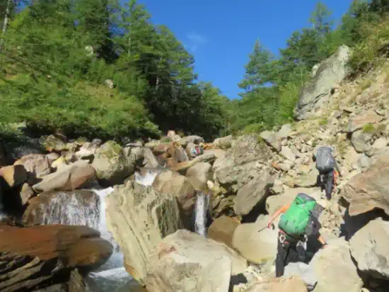 | 【9月14日】 | ワリモ沢出合(5:15) → 赤沢出合(6:45) → 硫黄沢出合(7:40) → モミ沢出合(泊)(12:50) |