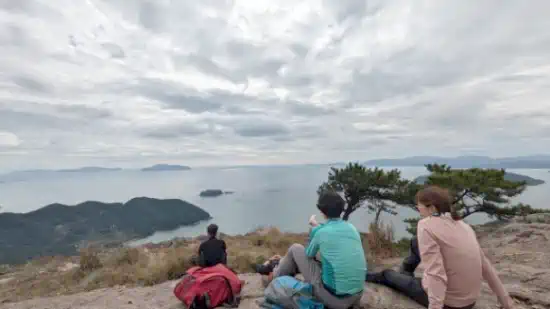 山頂で一休みした後、来た道を戻り、途中から島の南側にでる下山道に入る。下山道は、踏み跡がいくつかに分かれていて、分かりづらい場所もある。我々も途中で下山道から外れた事に気づき、軌道修正。無事に登山道から舗装路に出た。30分ほど急坂の舗装路を下ると海沿いの道に出て、そのまま潮風を浴びながら、海沿いの道路をてくてく歩き、港まで戻ってきた。