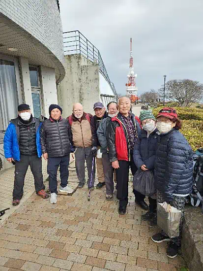 終点の湘南平で降りると景色は抜群だが、風が強く異常に寒い。それでも広い公園には結構人が歩いていた。少しは歩くのかと思っていたが、公園の階段を少し登った園内の片隅がゴールで宴会場所だった。直ぐに原口さんも到着して宴会を始めようとするが、ともかく風も強く寒い!その上、公園の管理人のオジサンが自転車で巡回してきてここは火気厳禁だとお叱りを受けた。万事休すと呆然としていると、少し離れたところで原口さんが何やらオジサンと話している。
