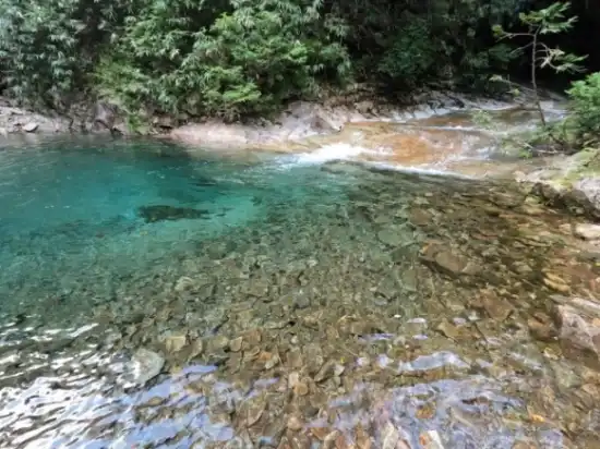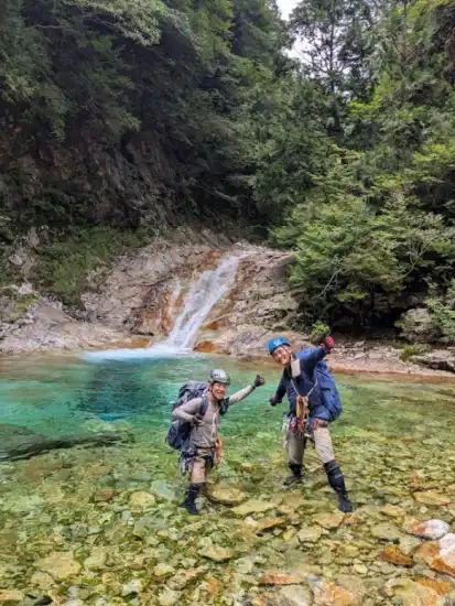 前夜はいつもの道の駅。ワイルドフィールズおじかの手前の林道路肩に車を一台デポする必要があるので道の駅を4時半に出発する。デポ後に大蛇尾林道を進み、送電線を横切るあたりの広場に駐車してそこから歩き始める。大蛇尾林道は事前情報で結構荒れているとのことだったので、だいぶ手前に止めたが、実際はそんなに悪くなかったのでもっと奥まで入っても問題なさそうだ。駐車できるスペースはところどころにある。リーダー(私です)がぎっくり腰明けで初めての本格的な沢登りということもあり、こまめに休憩を取りつつ、ゆっくりゆっくり歩いて2時間半ほどかけてようやく吊り橋に到着し、ここから入渓する。陽の光を浴びた清流は圧倒的な透明度でキラキラと輝いており、メンバーのテンションは最初からマックスとなる。更に2時間弱で二俣となり、我々は左手の西俣へと入っていく。すぐにヤギ滝が出てくるが西俣はここが魚留めとなる。今日の水量ならヤギ滝は十分登れそうだったが、メンバーのクライミング力と時間を考慮して当初の予定通り左岸より巻いて越える。滝の上は夢にまで見た(ちょっと大袈裟かな?)大蛇尾ブルーの始まりだ!