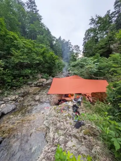 時間的にも幕場を探すために竿をしまい、暫く歩き続けると1,360m付近にいい幕場を見つけました。薪を拾い寝床を整地して、焚き火の場所もタープの位置もベスト過ぎて、タープの下で焚き火の暖かさを感じられて最高の幕場でした。タープの張り方や焚き火の仕方などとても勉強になりました。担いできたビールは沢で冷やして乾杯。夕食はサムギョプサルにして、ご飯も美味しく炊けてお腹も膨れて大満足。森林香のお陰か虫も思ったほど寄って来ず、心地良く眠りにつく事ができました