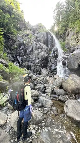 後片付けと出発の準備をして、小至仏山を目指して2日目がスタート。朝から気温が高く、ジリジリと太陽の日差しを感じる暑さでした。沢に全身浸かると涼しくて丁度いい。歩き始めて程なくすると途中大きな20メートル滝が現れました。右岸が階段状にはなってはいますがボロボロと岩が崩れてとても脆く、ロープを念の為出してもらいました。