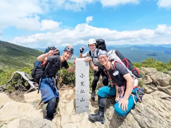 稜線に近づくと、岩場が出てくるけれども大した藪はなく、ハイマツがあるくらいでとても快適で歩きやすい詰めでした。あまりの居心地の良さに何度も休憩をしました。登山道に出るとたくさんの登山客がいて、ハイマツから出てくる私達にちょっと視線が集まるのを感じました笑 山頂で記念撮影をして、少し休憩をとってからハーネスなどを外し、登山客に紛れて鳩待峠まで登山道を使って下山しました。
